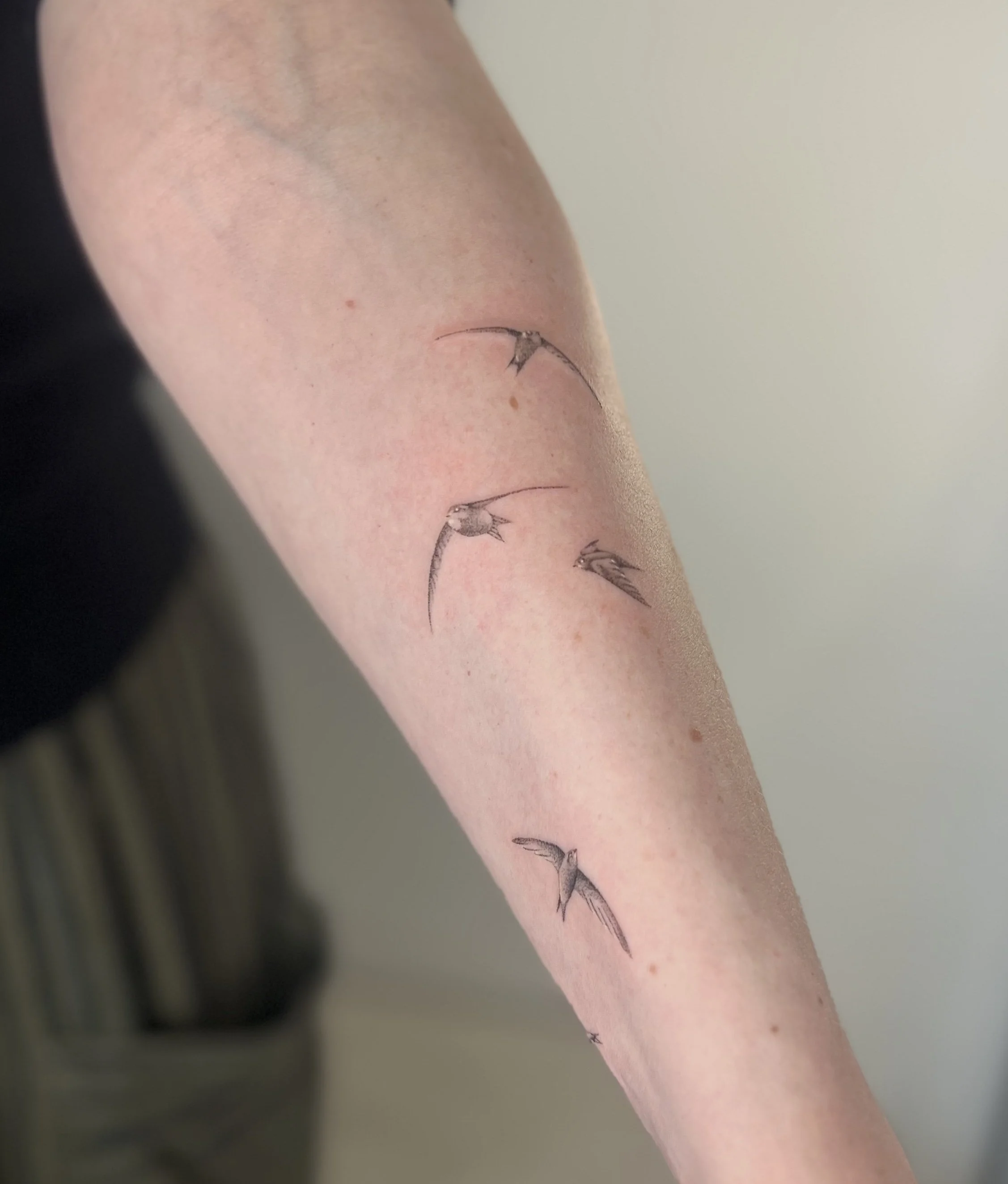 The fine-line, hand poke technique lends itself perfectly to the tiny, light details of a bird. A bird in flight can represent freedom, a new chapter, a journey; or a a bird gently perched can remind us of peace, wisdom and contemplation. My bird tattoos are usually based on a reference image of which there are thousands on Google of every species of bird at every angle, so it’s a good idea to include one or more that you love in your form.